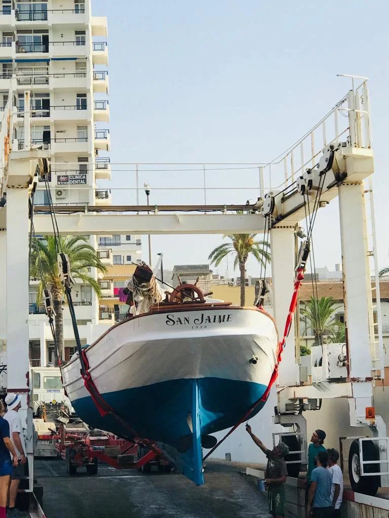San Jaime entered into service in 1928, transporting passengers and cargo from Escalo to Ibiza. Her original owner was Jose Juan Torres, also known as Pep Campanix from Escalo. During this time, Formentera had no port— the only port was in Escalo, so the Campanix family built a ramp and winch system -still existing on the family property today- to pull the boat out on Formentera.